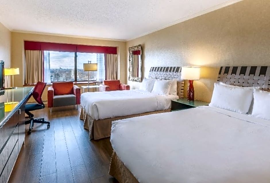 A flat-screen TV, fridge, coffee maker, large closet and full bathroom are featured in this room. Guests have a view of the West side of the city.